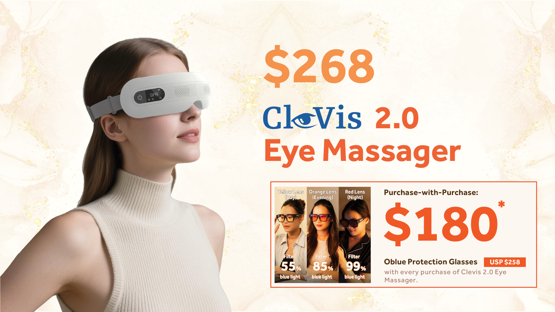 Take charge of your vision! Get the OBlue Protection Glasses at a special price of $180 (usual selling price: $258) with every purchase of our Clevis 2.0 Eye Massager.