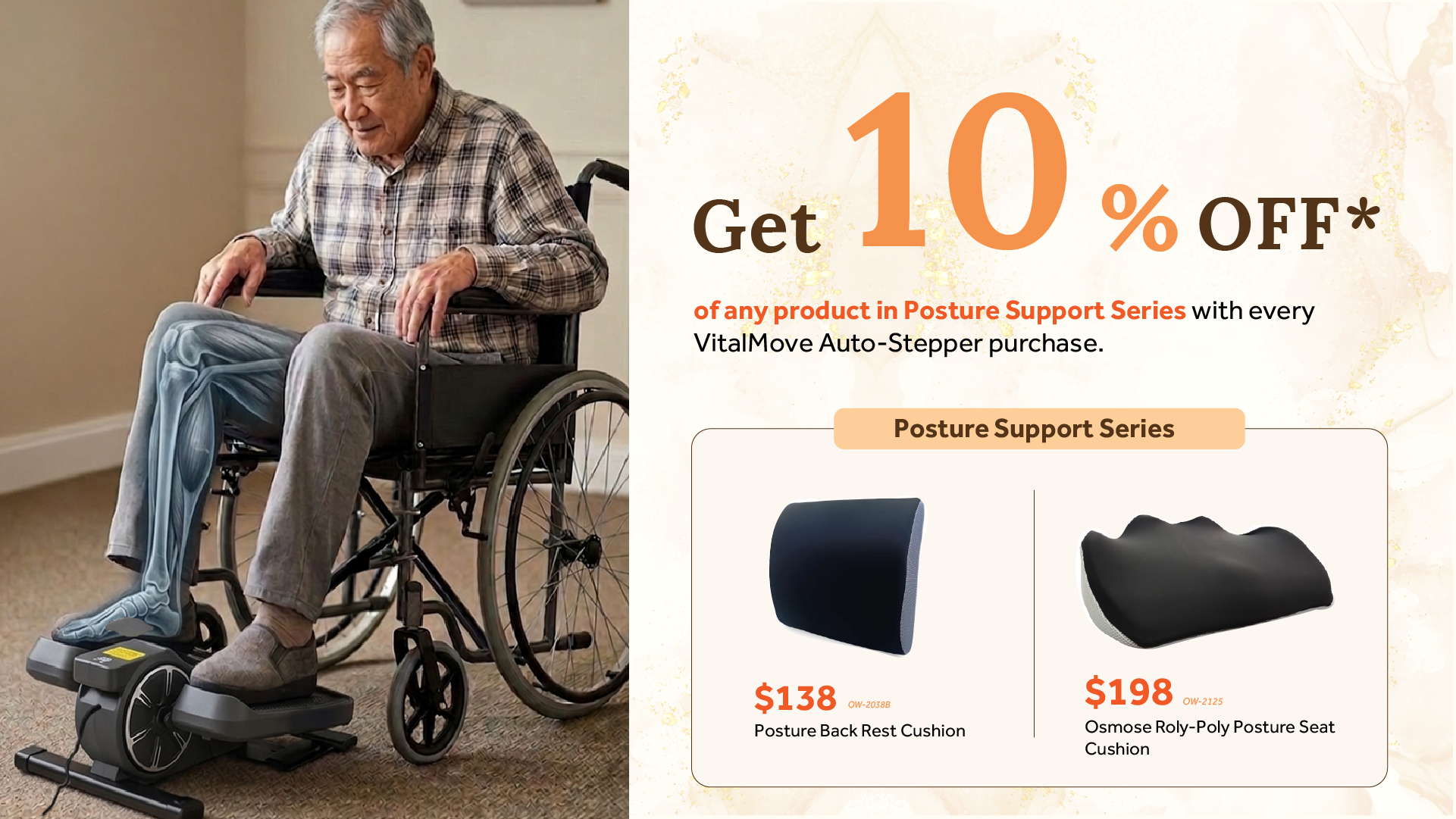 Sit with comfort and work your lower body! Enjoy 10% off any product in our posture support series with every purchase of the VitalMove Auto-Stepper.